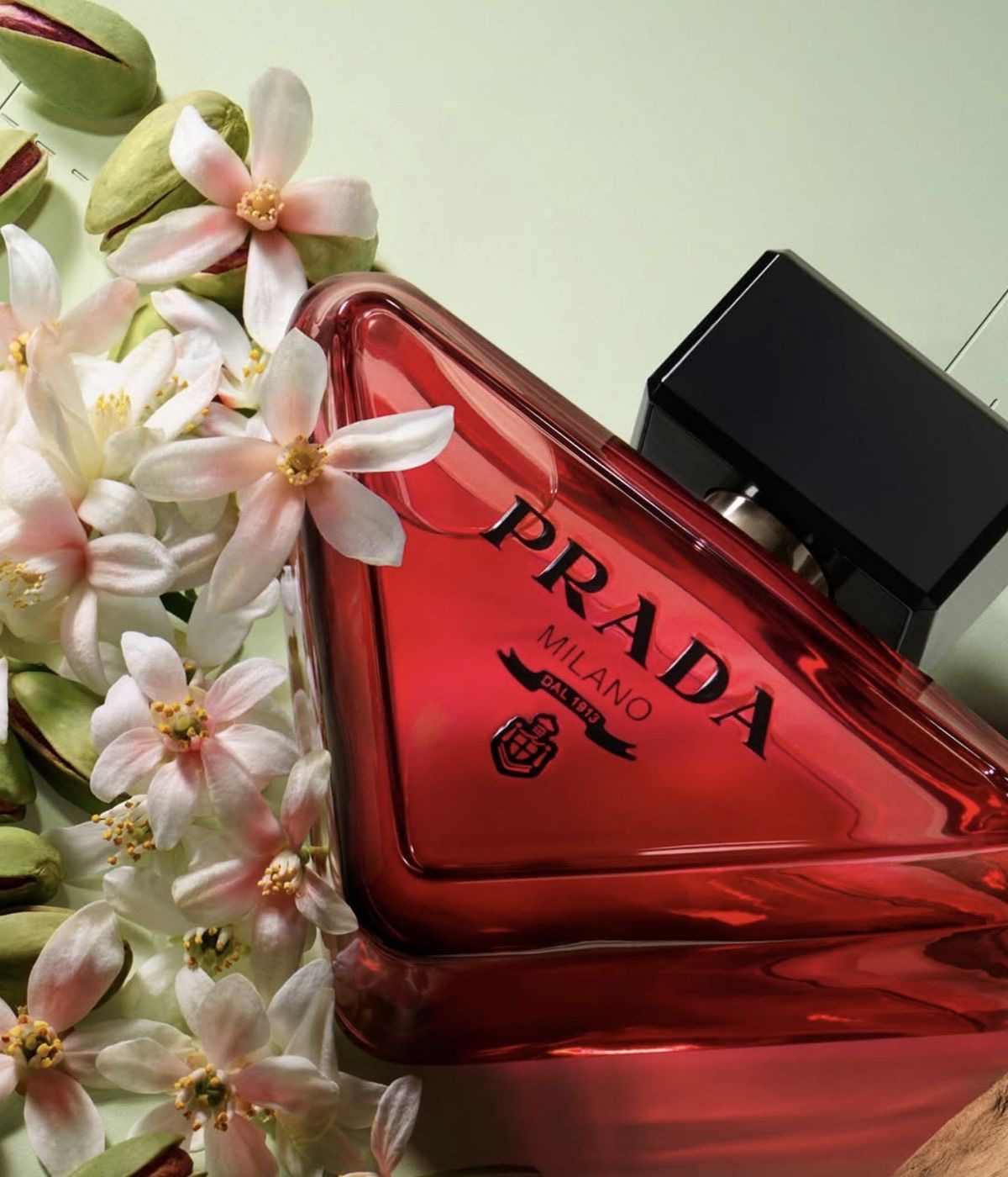 Sobre o frasco: Como a assinatura original, a garrafa renovada da Paradoxe Intense é uma expressão da essência da casa de reinvenção e predileção por contrastes. Em uma mudança da arquitetura tradicional do frasco de perfume, o flacon é minimalista e delicado à primeira vista, inspirado no icônico logotipo triângulo da Prada original, projetado de forma disruptiva para descansar em sua lateral.